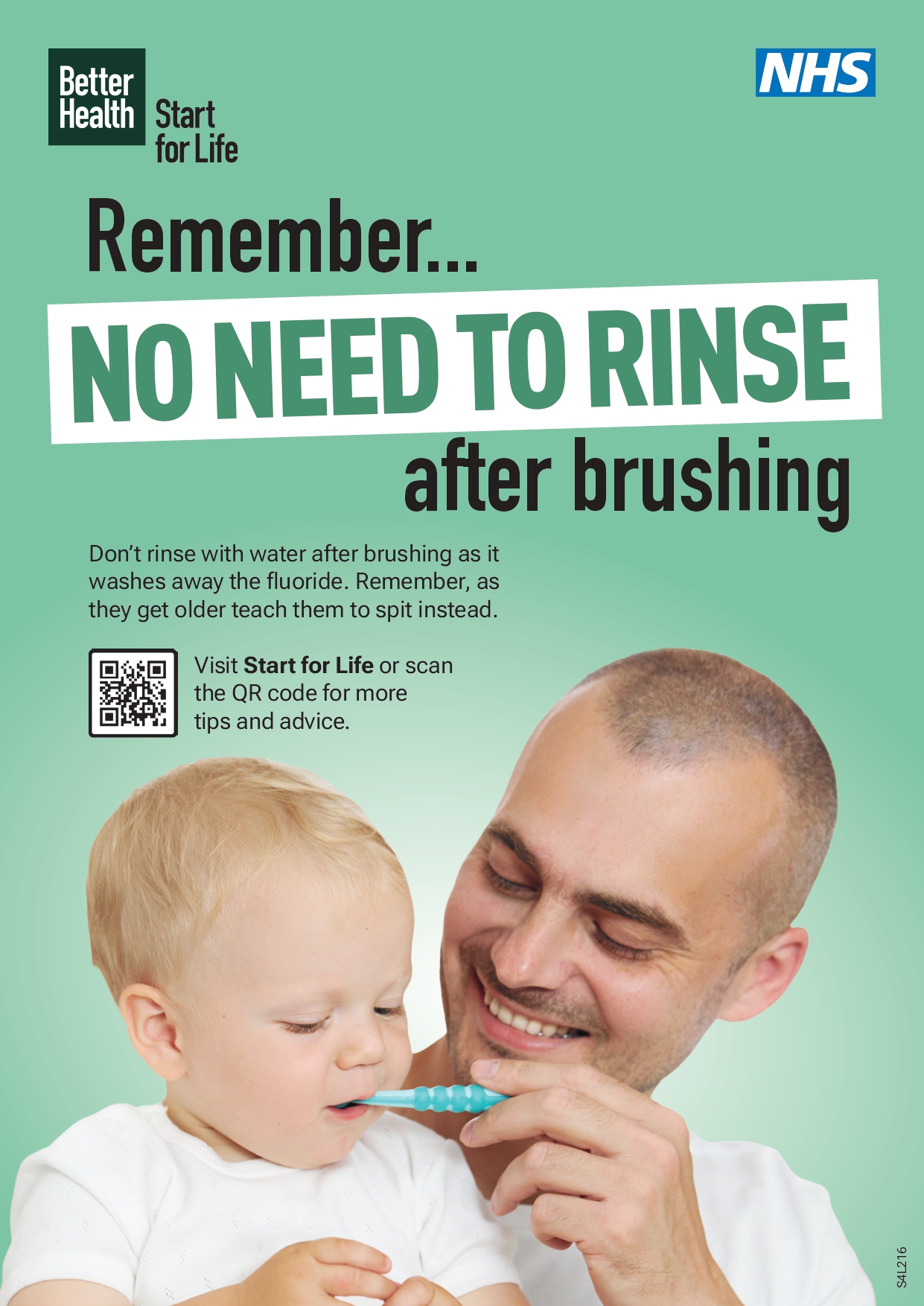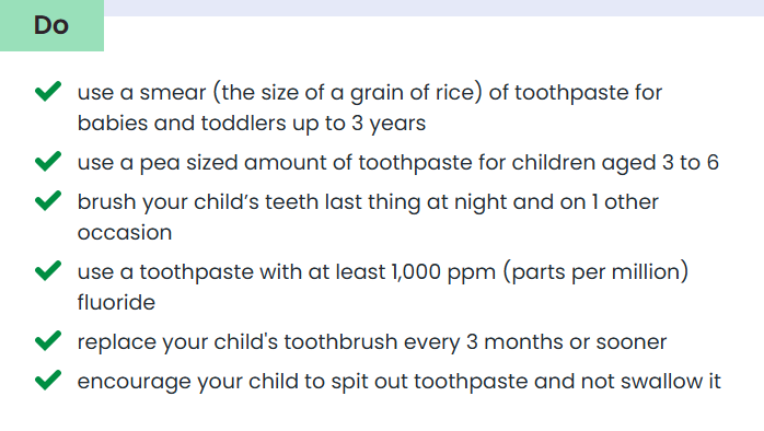 - “No need to rinse” which is to encourage children to spit not rinse as they get older
